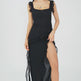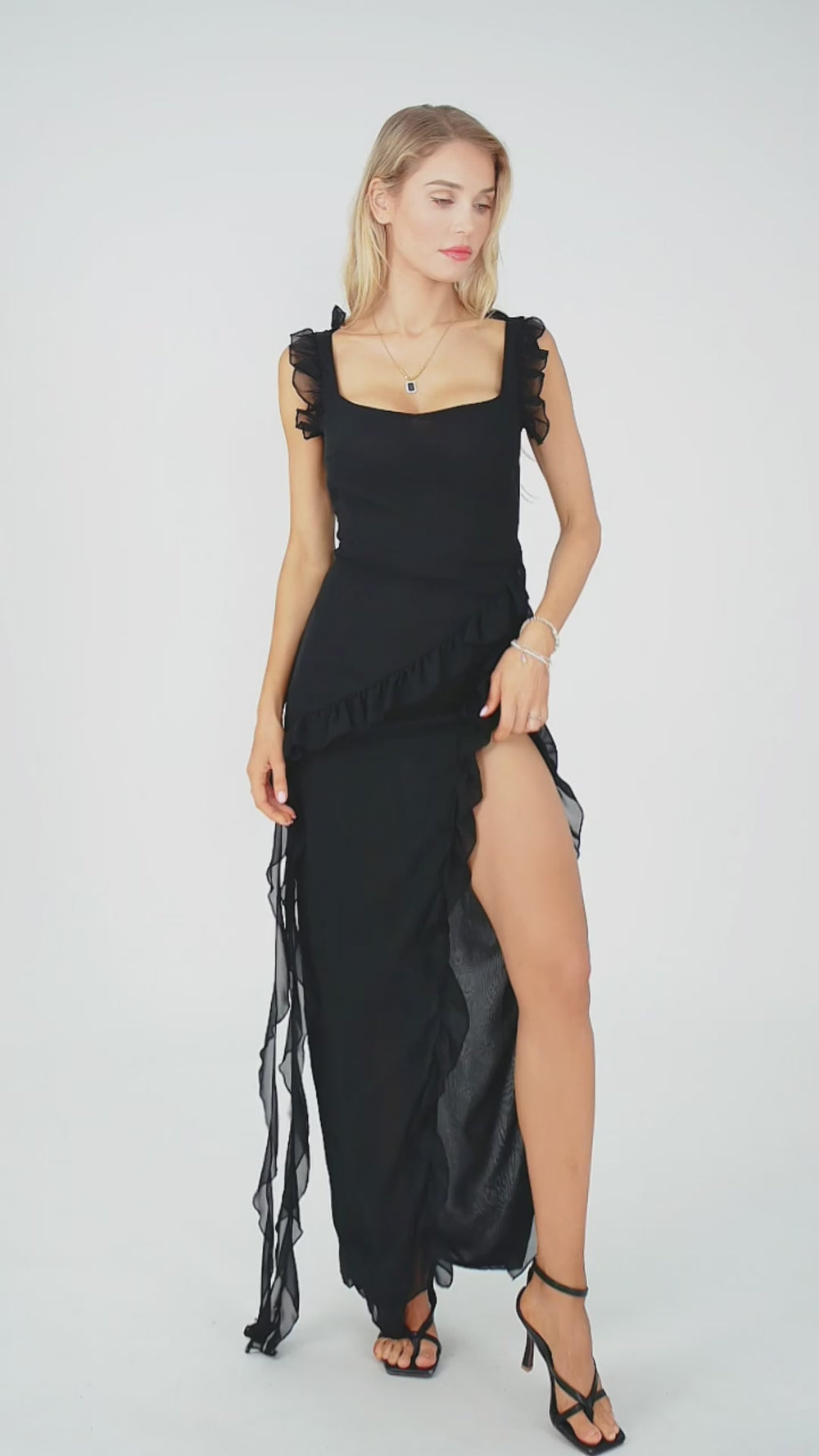 Fügen Sie Ihrer Abendgarderobe mit unserem Kleid mit dem Rüschenschenkel eine spielerische Raffinesse hinzu. Dieses Kleid mit einem schmeichelhaften quadratischen Hals und sexy Spaghetti-Gurte bietet ein flirtiges Rückenless-Design und eine Oberschenkelhöhe für einen Hauch von Drama. Dieses Kleid ist perfekt für jede Abendparty und wird Sie zum Mittelpunkt der Aufmerksamkeit machen.