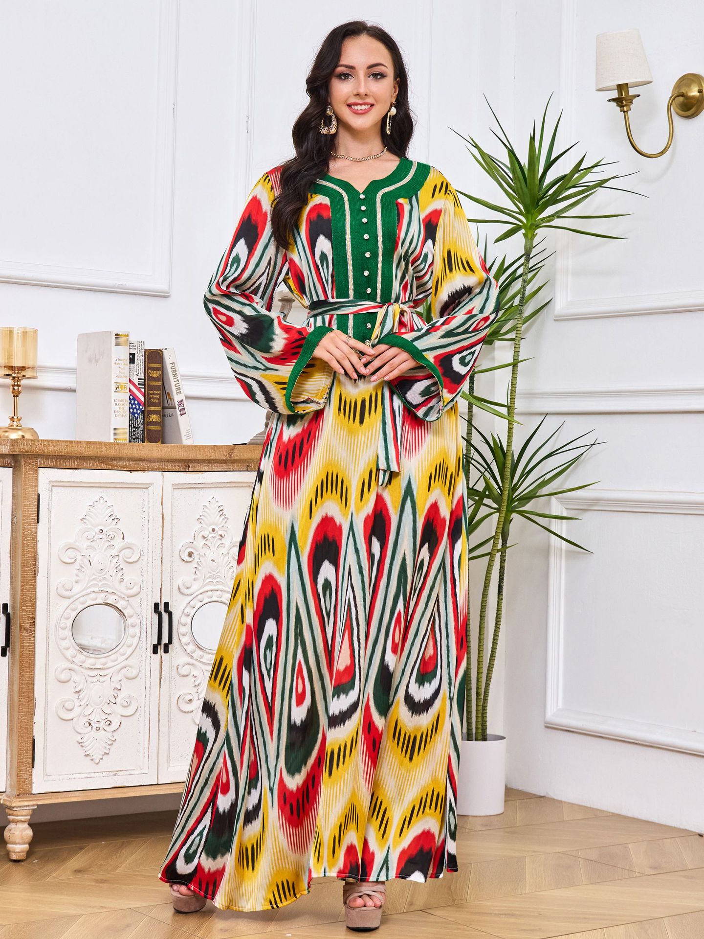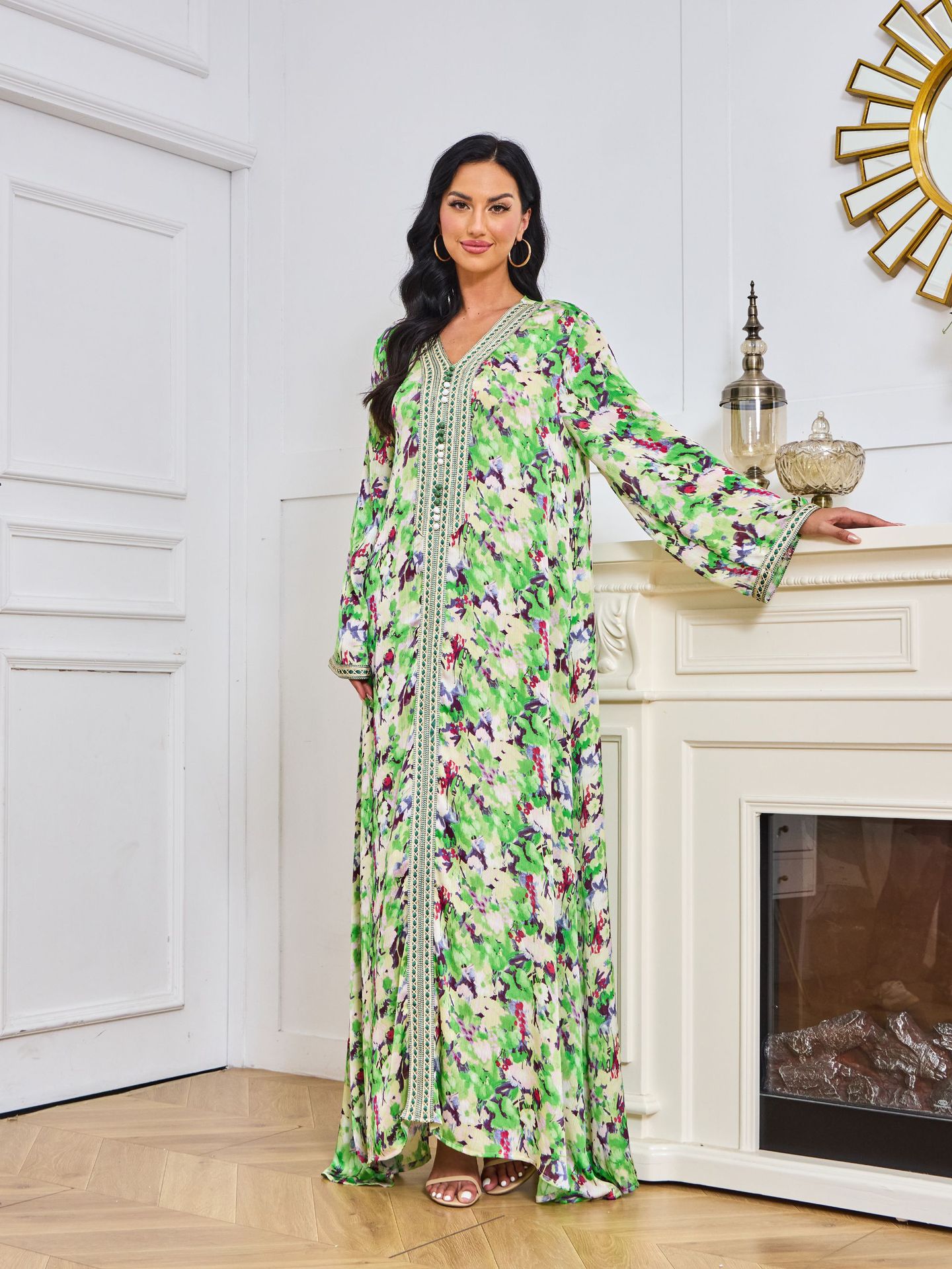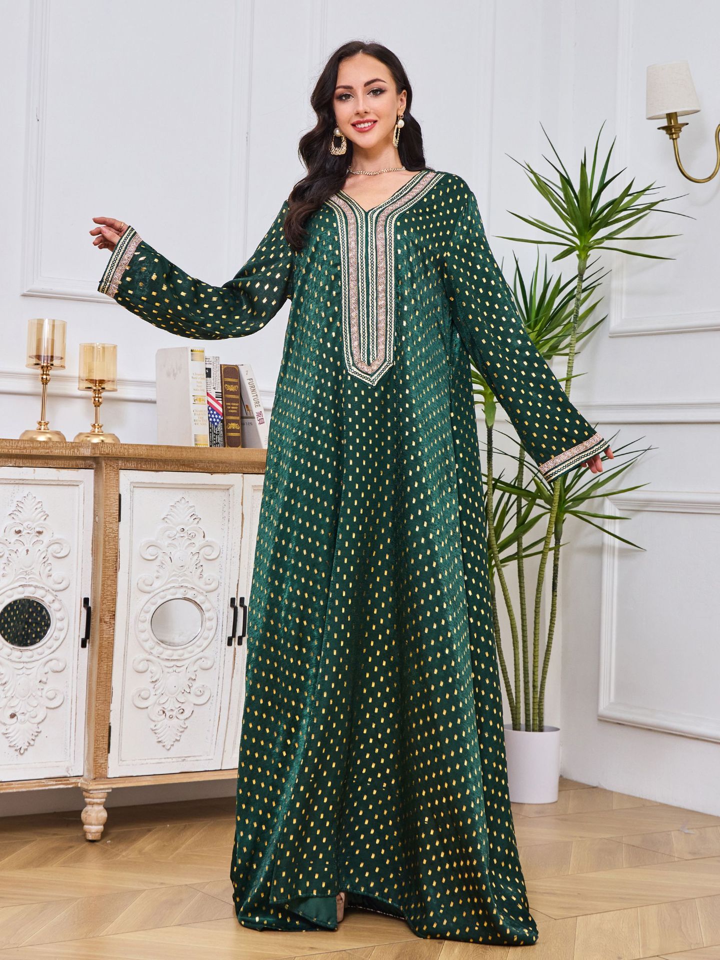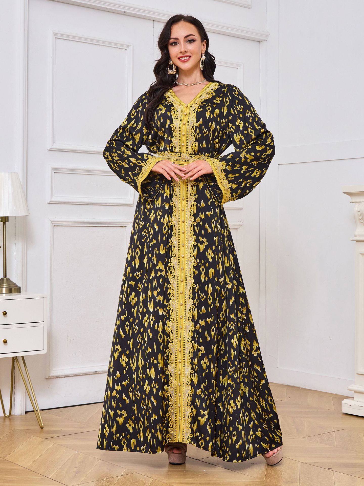 Robe Abaya de Dubaï avec Pierres Chaudes Imprimées et Détails Brodés